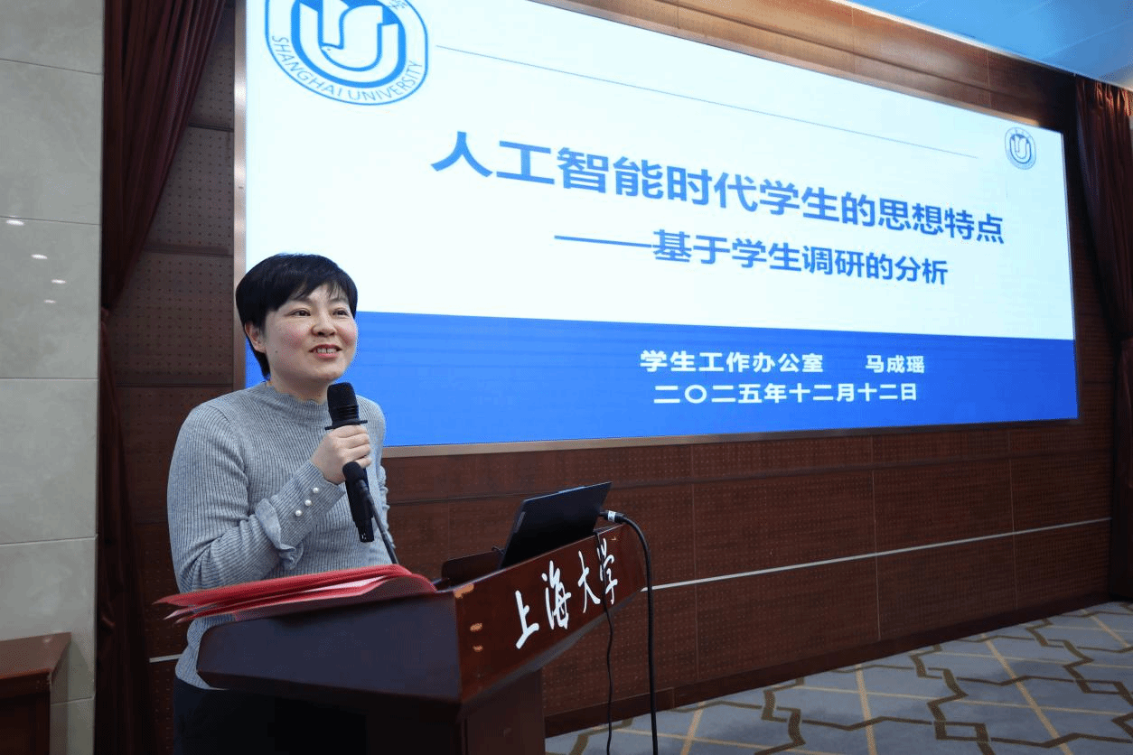 学生工作办公室副主任马成瑶教授报告主题是《人工智能时代学生的思想特点——基于学生调研的分析》,她基于对上海大学学生滚动调研的数据,指出B站、小红书、抖音是学生最常用的网络平台,而AI工具学生辅助作业、学术研究的日常伙伴,勾勒出“Z世代”的矛盾特质:渴望价值实现却畏惧吃苦,热衷圈层文化却追求“轻社交”,既认同“人生出彩”的多元赛道,又对艰苦环境持保留态度。她的报告为“如何培养适应AI时代的未来人才”提供了鲜活注脚。