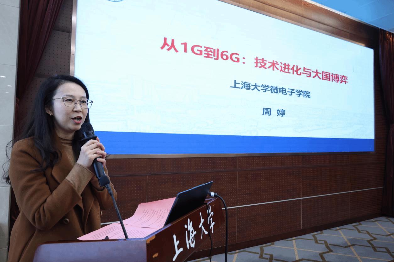 论坛上,五位来自不同学科领域的女教授围绕人工智能与女性发展的主题带来了一场思想盛宴。微电子学院副院长周婷教授以《从1G到6G:通信技术进化与大国博弈》为题,梳理了移动通信四十年间的代际跨越,揭示了从1G到6G技术迭代背后的各国竞争与战略布局。她告诉大家,6G不仅是速率的提升,更是AI深度融入通信网络、感知与计算融合的未来,因此发达国家正通过联盟组建、政策引导等方式来争夺技术高地,而中国也正进行“移动信息网络”重大专项布局6G研发,上海大学亦参与其中。